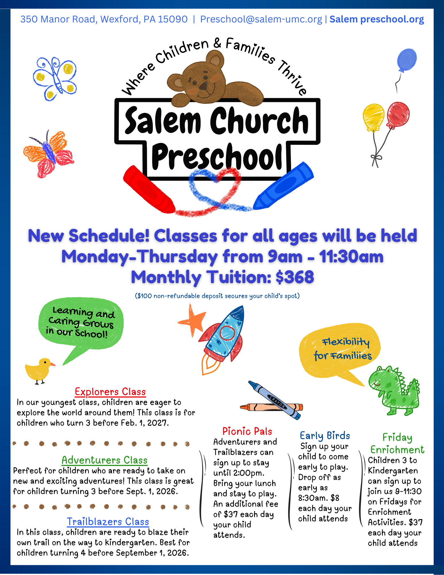 Nestled in a quiet Wexford neighborhood, Salem Church Preschool has been an integral part of the community since 1971. At Salem Church Preschool, we provide a nurturing and engaging learning environment where our dedicated teaching staff thoughtfully designs experiences that promote growth, discovery and joy. Each child is recognized as a unique individual with their own gifts to share with the group, enriching the classroom community as a whole.