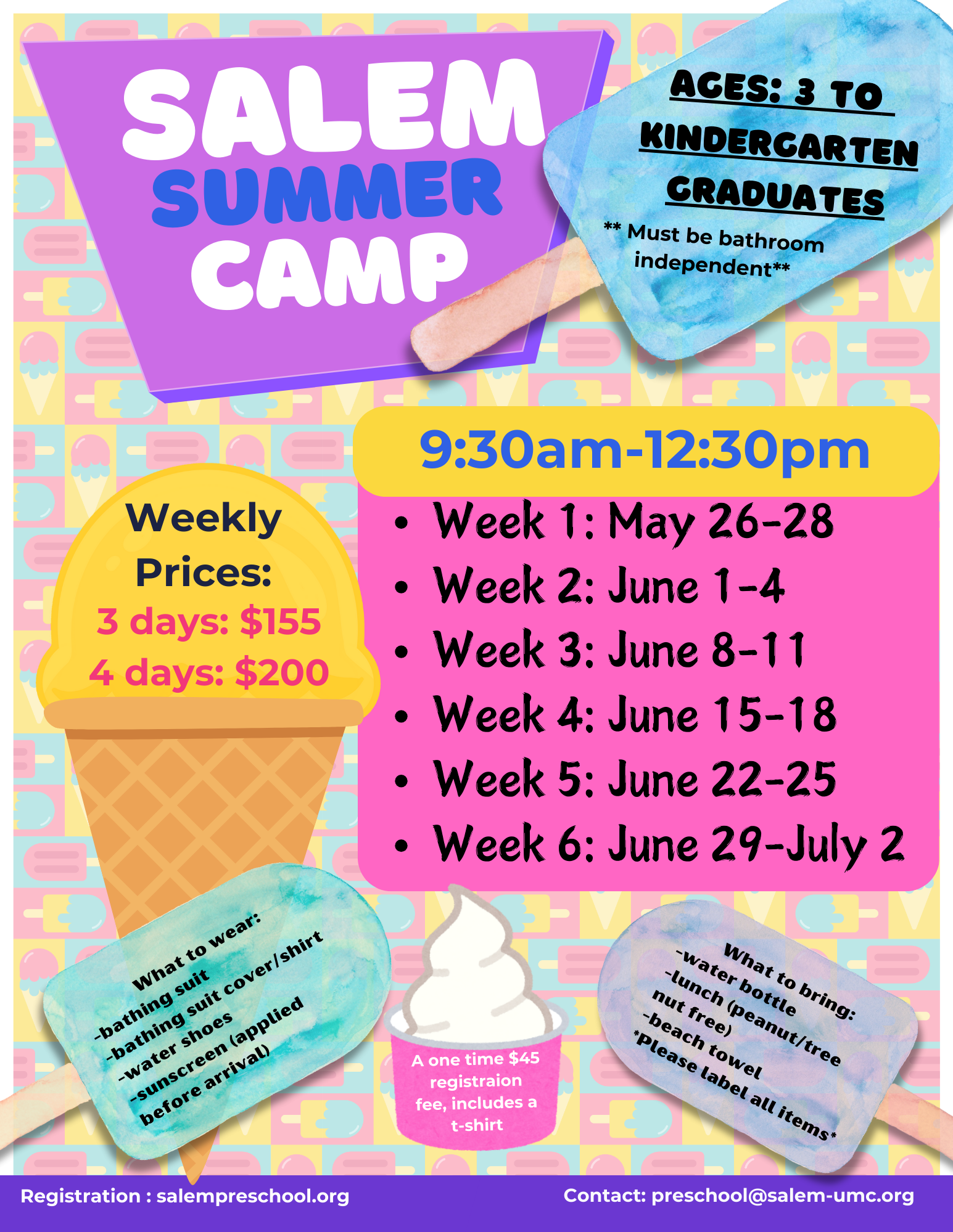 One time non-refundable registration fee of $45, includes t-shirt. Payments due the Saturday before each week of camp.